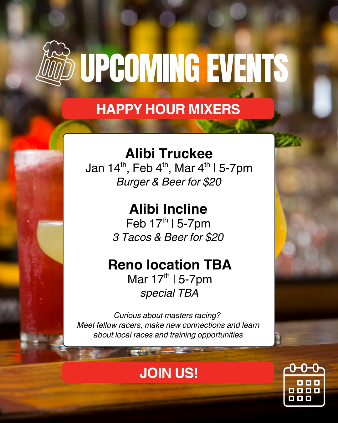 If you’ve been thinking about getting into masters racing, want to learn more about local training opportunities or just curious about what masters is all about, come meet fellow racers, coaches and fans and let us answer any questions you might have.